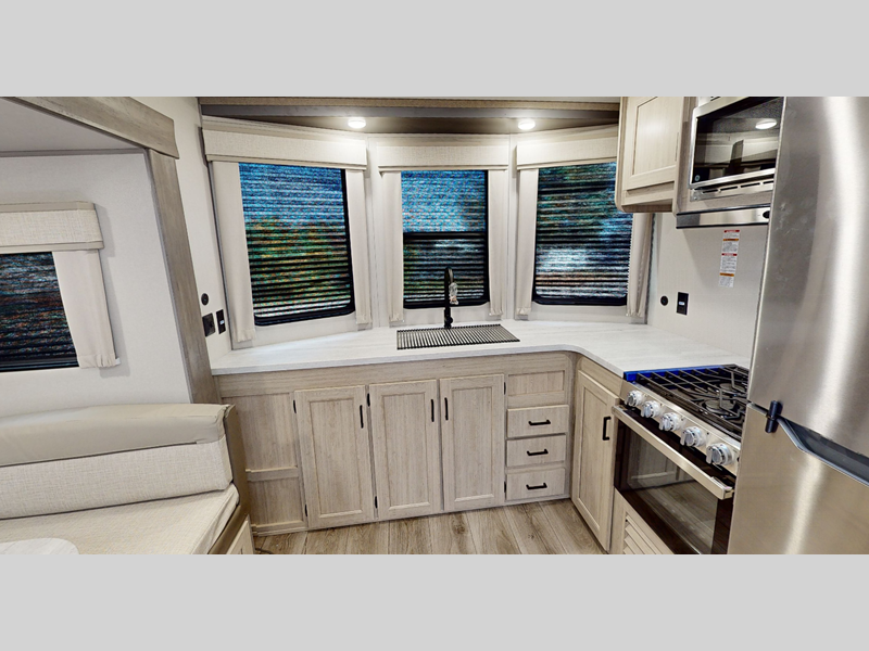 Each is built on a cambered structural steel l-beam frame so you can enjoy your RV for years to come, and EZ Lube axles with leaf spring suspension provide smooth towing. There are also premium JBL exterior speakers, a heavy duty tongue jack, universal solar prep, plus many more exterior conveniences. The interior will feel like a residential home with its GE appliances, seamless thermofoil countertops throughout, premium Serta mattress, and Congoleum woodplank linoleum flooring.