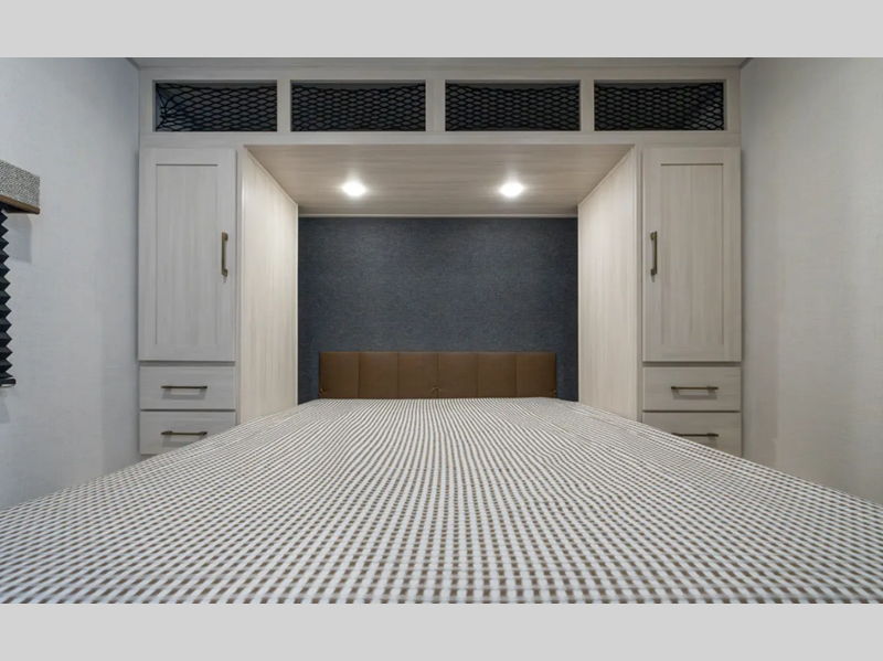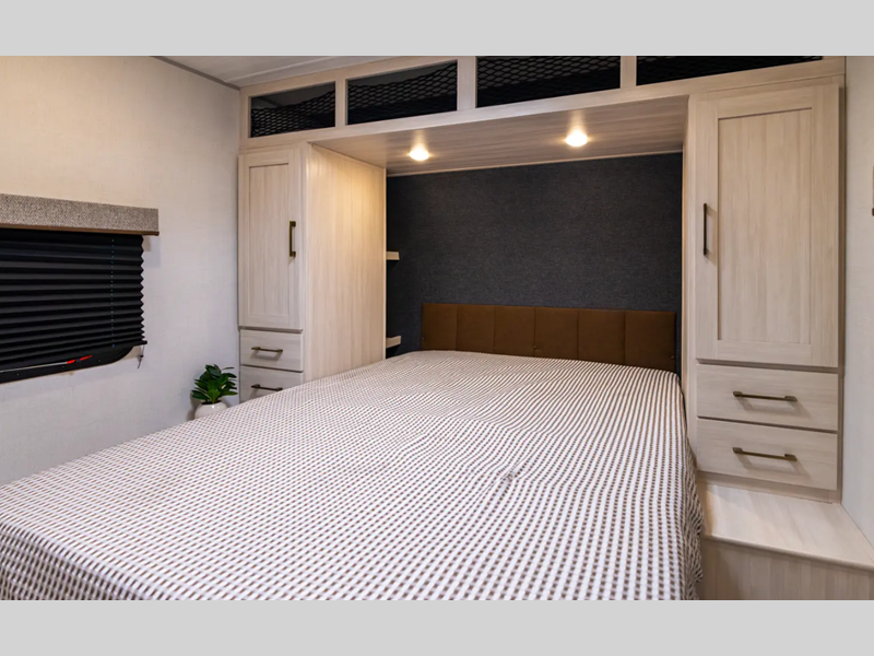 These travel trailers are extended season ready with a 2" aluminum framed floor and block foam insulation, plus there is a sealed underbelly with forced heat and radiant foil insulation. You'll love the Surf(X) seamless countertops throughout, and there is a tankless water heater for endless hot showers. Outside, a power tongue jack is ultra convenient and there is a hot and cold spray port to wash off hiking gear!