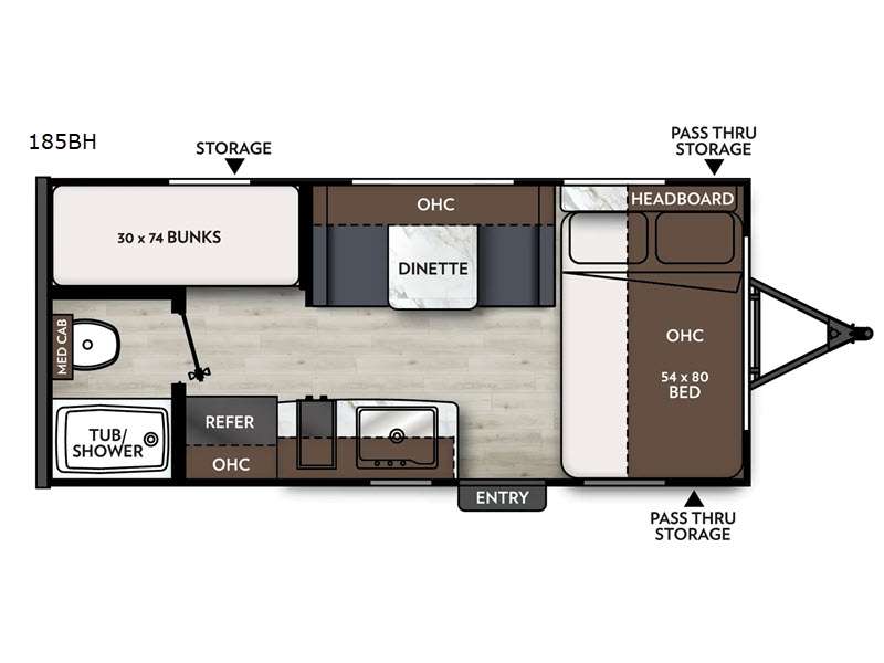 There's a comfortable place for everyone to sleep in this travel trailer with a front 54" x 80" bed and set of 30" x 74" bunk beds! The booth dinette can even transform into an extra-sleeping space when you're not using it to enjoy a meal prepared with the two-burner cooktop, microwave, and 8 cu. ft. 12V refrigerator. The rear corner bathroom has a tub/shower for you to start your mornings feeling clean and fresh, plus a medicine cabinet to keep your toiletries close. You will have plenty of room to store your outdoor gear between the front exterior pass-through storage area and the rear exterior storage area!